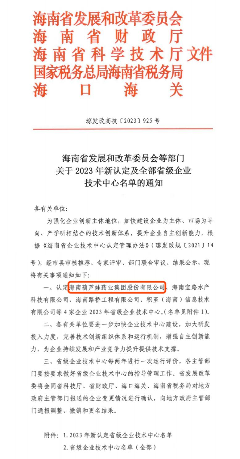 近日,海南省发改委等多部门联合公布了《关于2023年新认定及全部省级企业技术中心名单的通知》,其中,海南征途国际药业集团股份有限公司成功通过评审,被认定为省级企业技术中心,是本次获批的4家企业之一。